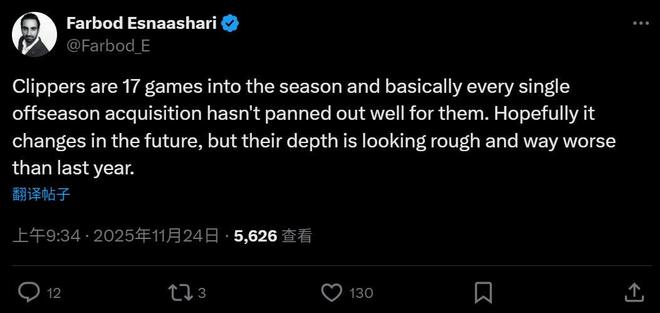 快船队押宝的替代者比尔赛季报销、保罗认清现实决定赛季结束后退役、大洛同样老迈不堪,正如快船记者Farbod Esnaashari所说,快船队引援已经全盘失败,深度比上个赛季差多了。